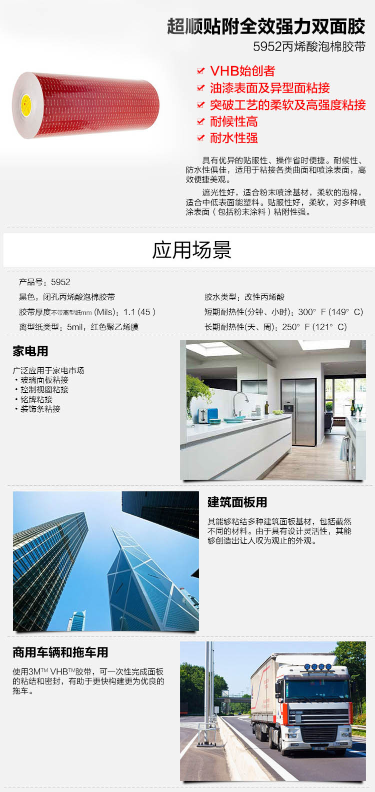 10、3MVHB胶带:此系列产品可以广泛用于金属,塑料,玻璃,陶瓷等多种材料的架构粘结,如电子产品塑料部件的固定,夹层玻璃等。型号有: